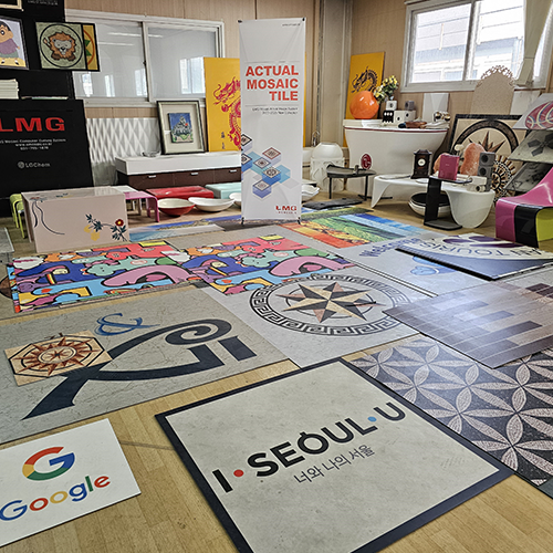 LMG Mosaic creates a beautiful living space by processing various materials with advanced techniques securing global competitiveness.The company is a total supply maker which provides customers with the best service by applying design concept to interior construction materials. LMG Mosaic is a professional maker which develops and produces attractive mosaic products with various design expressions using precise computers to create more pleasant andbeautiful special culture for customers. Visual effects are maximized at department stores, hotel, school, exhibition hall,discount store and any other places to achieve differentiation to increase sales and create synergy. We develop and produce interior construction materials and the materialsfor precision industry with various materials including plastic PVC, Rubber, carpet,using precision computer machines and processing methods.Our products are installed in the commercial facilities which want to produce high-class atmosphere such as school, sports center, department stores, discount store, art center, hospital, elevator. With various patterns in precise design and high-precision processing machines using computers, we decorated with mosaic a sports center in department stores and the whole area of Samsung Home Plus discount store.